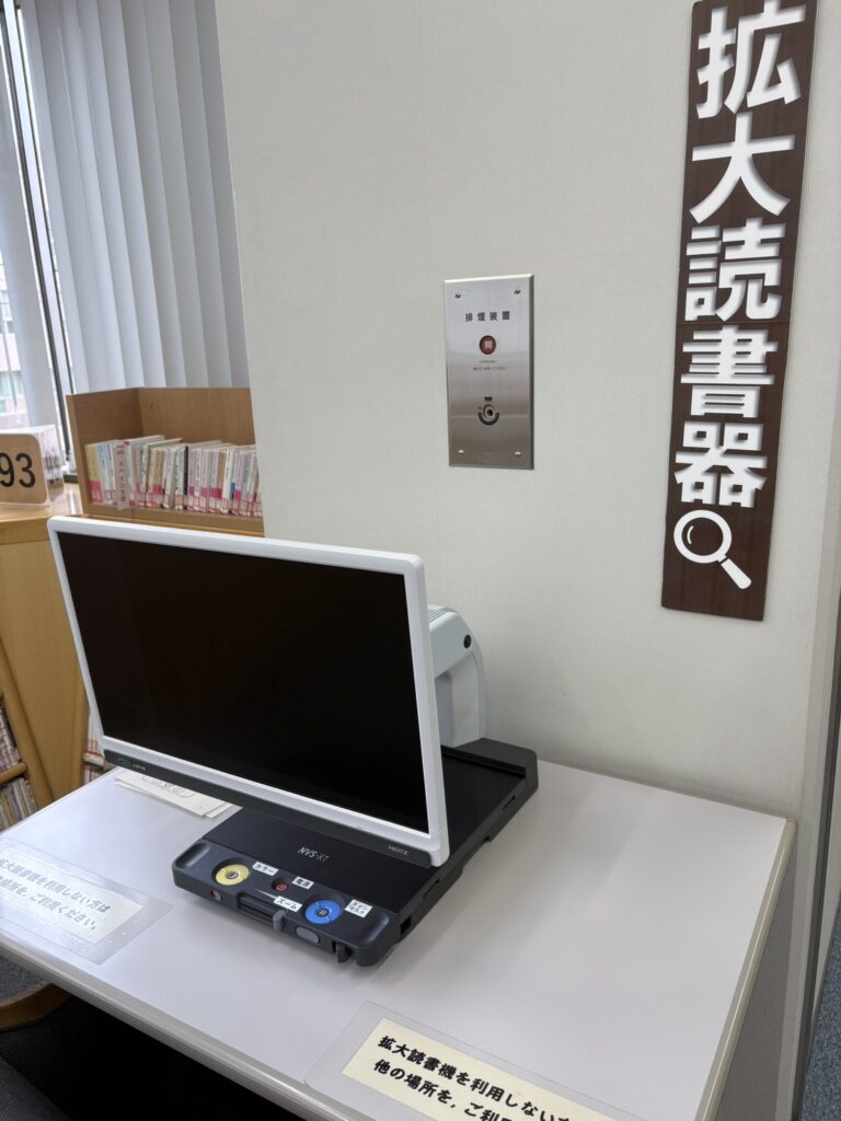 拡大読書器という普通の文字が読みにくい人でも、読書できるような設備も整っています。